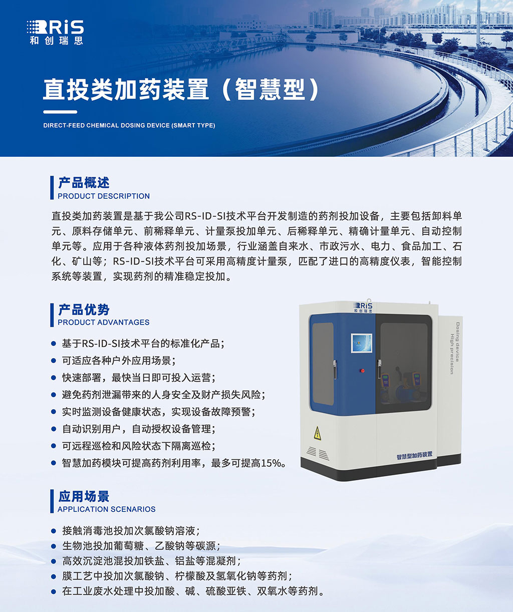 - 描述:基于RS-ID-SI技术平台的标准化产品; 可适应各种户外应用场景; 快速部署,最快当日即可投入运营; 避免药剂泄漏带来的人身安全及财产损失风险; 实时监测设备健康状态,实现设备故障预警; 自动识别用户,自动授权设备管理; 可远程巡检和风险状态下隔离巡检; 智慧加药模块可提高药剂利用率,最多可提高15%;